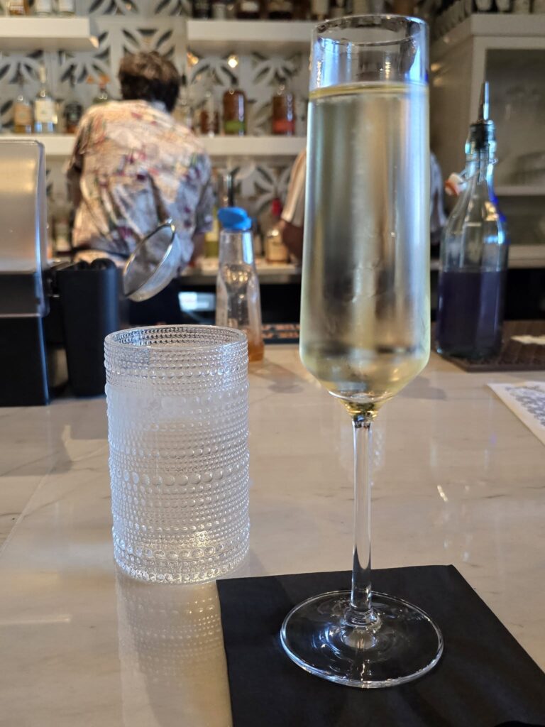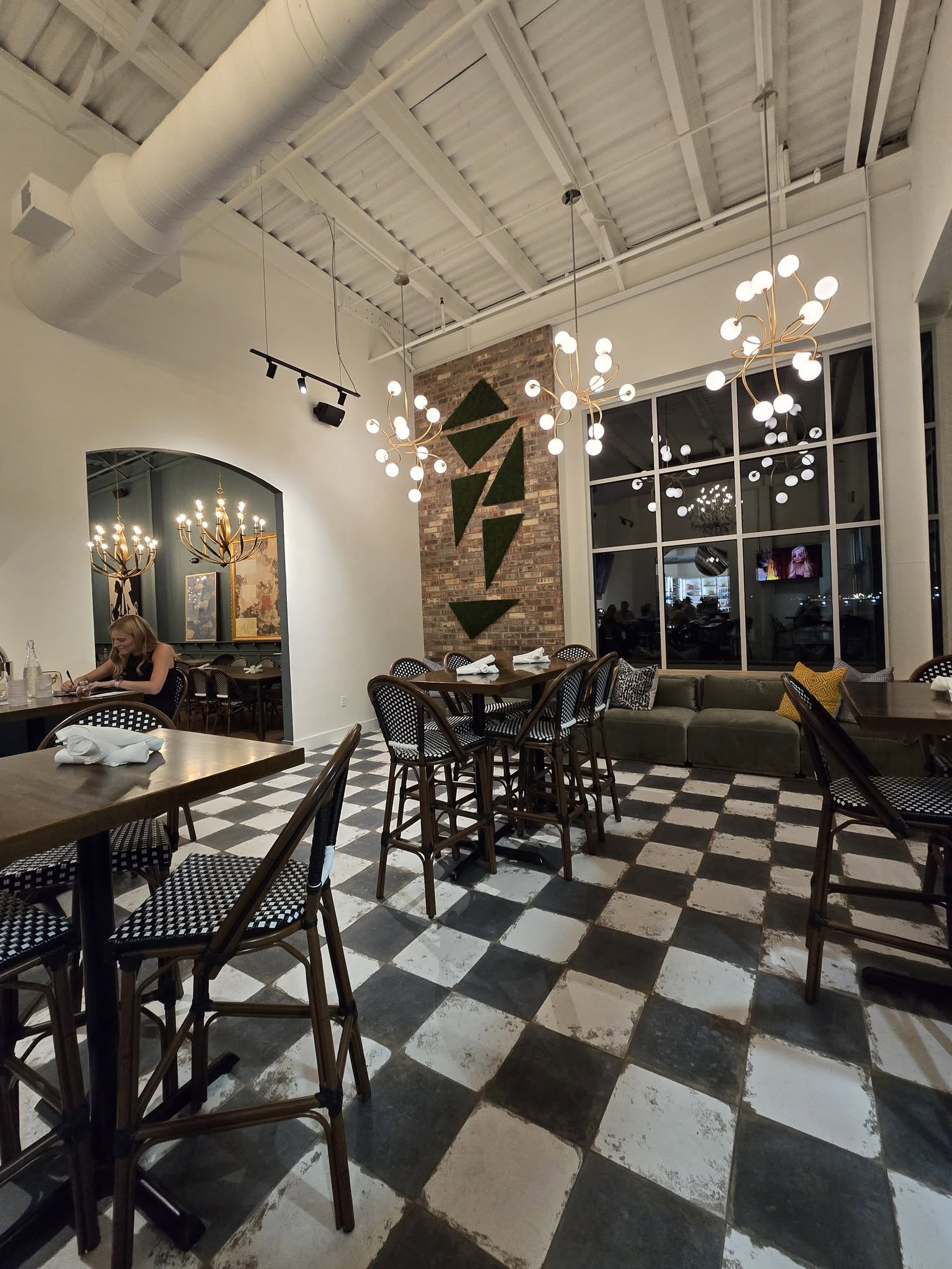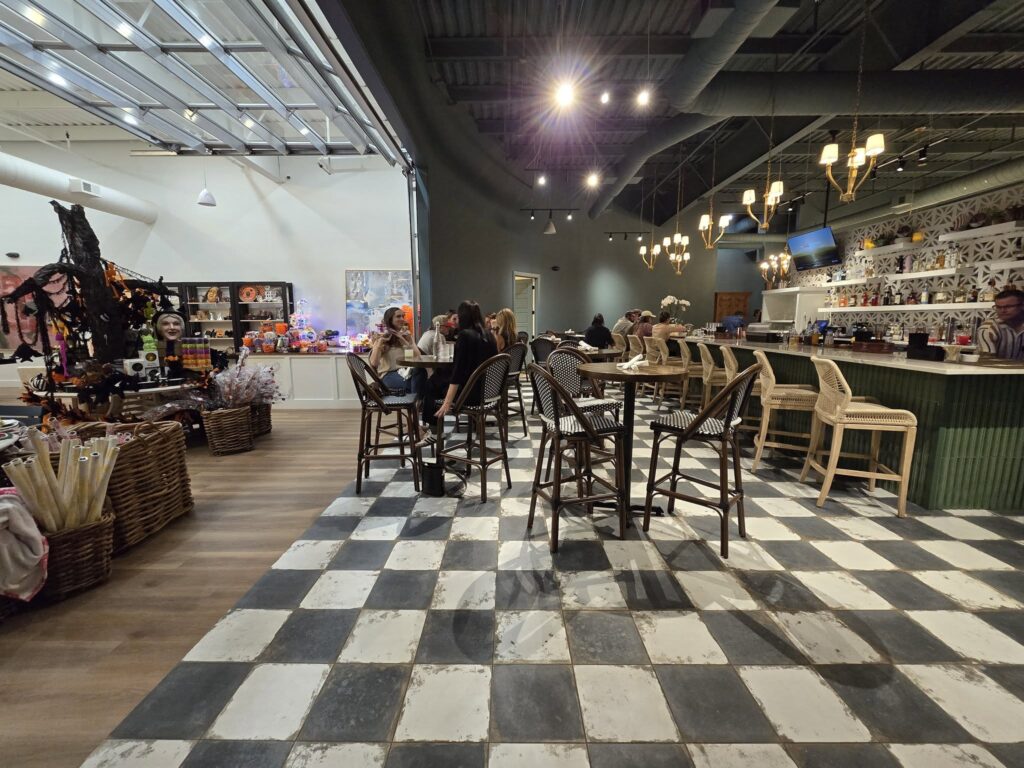 A “choose your own experience” bistro with a bar area, dining area, a patio, and a lounge type area with a couch. It is beautifully decorated with unique light fixtures and checkered flooring that flows into the wood plank dining area. There are TVs in the bar & lounge area. The menu features a variety of signature cocktails, wine, beer, and prosecco on tap. Try the Lavender Collins (Empress Indigo Gin, Elderflower Liqueur, Lavender Syrup, & Fresh Lemon Juice). Enjoy Italian dishes from charcuterie to salads, pasta, meatballs, flatbreads, and end with affogato (cold brew + vanilla gelato).