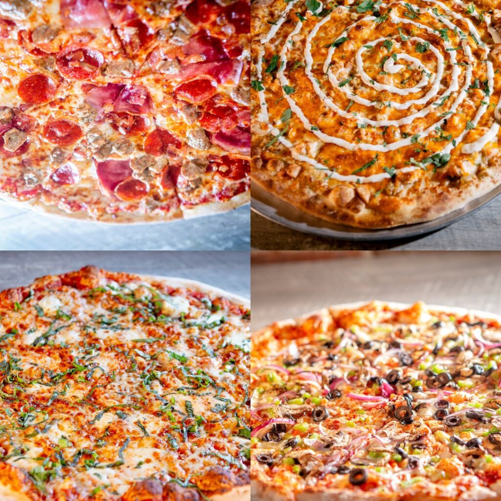 A variety of appetizers, wings, all sorts of pizzas, calzones, salads, sandwiches, burgers, wraps, pastas, desserts, variety of beer (including local), cocktails, and wine.