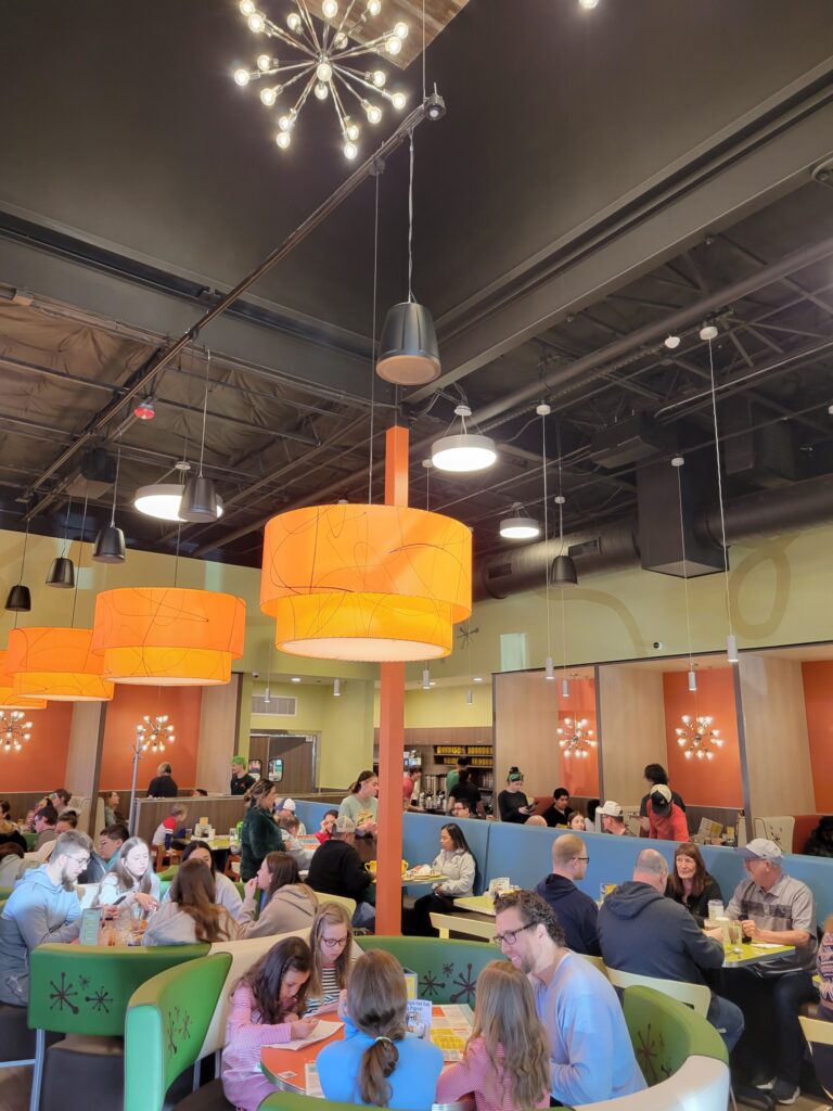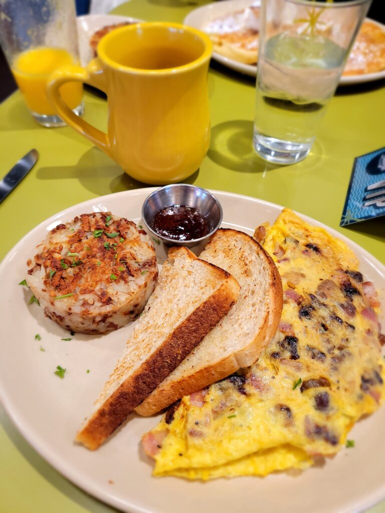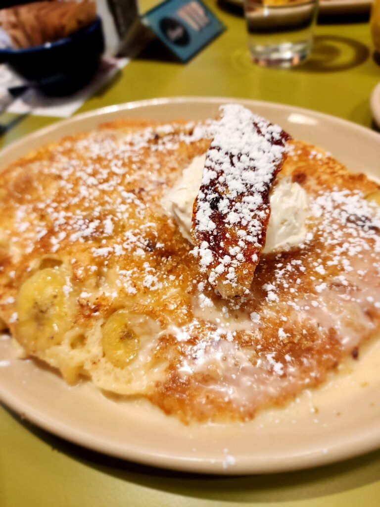 Coffees, boozy cocktails, classic breakfast items, French toast, pancakes, tacos, burritos, and more! There are plenty of options whether you’re feeling something savory or sweet! Plant-based and vegan options are also available. Be sure to check out the pancake of the week. We really enjoyed the banana crème brûlée pancakes!
